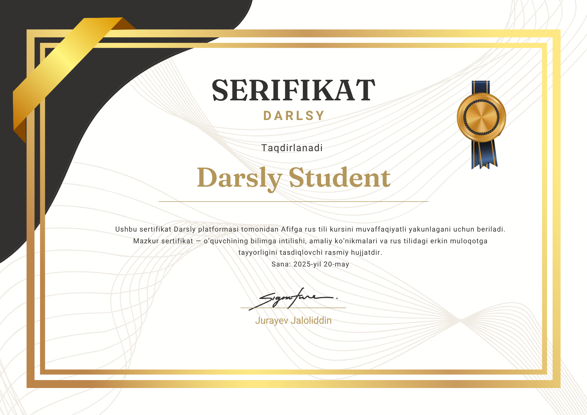 Kursni muvaffaqiyatli tugatganingizdan so‘ng sizga Darsly tomonidan beriladigan sertifikat taqdim etiladi.Bu sertifikat — sizning bilim va mehnatingizni tasdiqlovchi rasmiy hujjat bo‘lib, uni rezyumega qo‘shish yoki ishga topshirishda ko‘rsatish mumkin.Bu nafaqat ishonch, balki professional yondashuv belgisidir.
